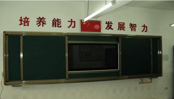 2. 外滑軌裝置:安裝兩塊移動綠板,兩綠板尺寸之和與內(nèi)軌道白板的尺寸一致;進(jìn)行常規(guī)教學(xué)時,可將此綠板滑動到液晶電視前方,保護(hù)液晶觸摸一體機(jī),增大書寫面積;進(jìn)行多媒體教學(xué)時,將綠板拉開,使用液晶觸摸一體機(jī)。